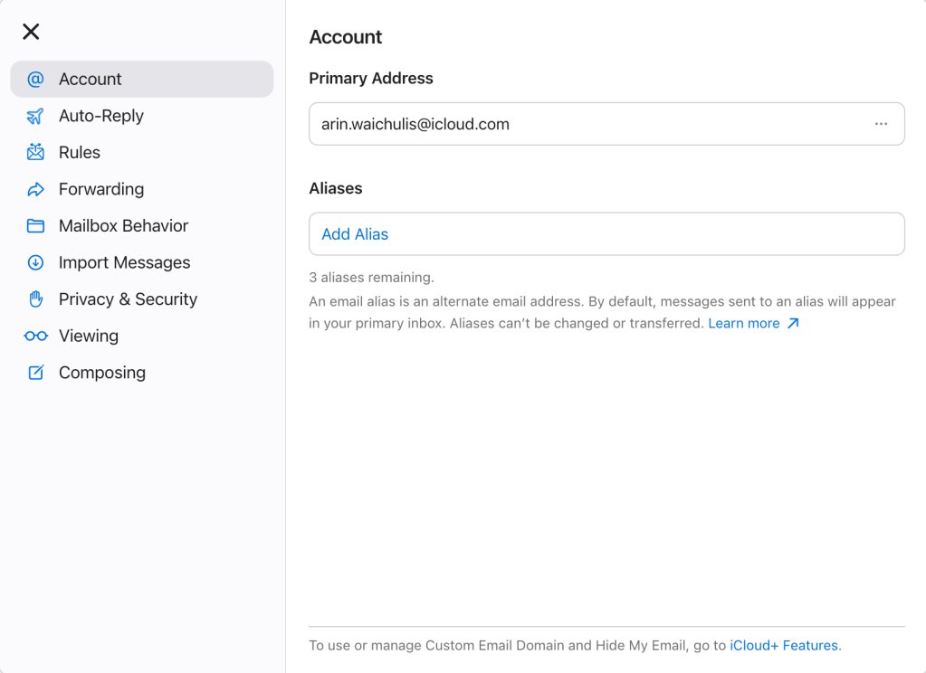 如果你没有订阅 iCloud+,iCloud 邮件在一定程度上也支持久经考验的电子邮件别名。但遗憾的是,每个 iCloud 账户最多只能创建 3 个别名。