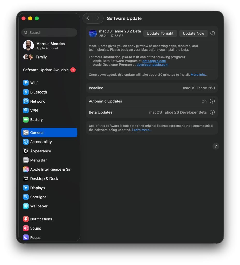 以下是安装 macOS Tahoe 26.2 开发者测试版第一版的步骤: