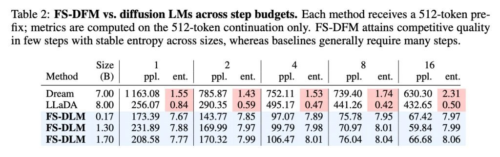 实验数据显示,FS-DFM仅需8轮优化即可生成完整段落,其质量媲美需上千步迭代的传统扩散模型。