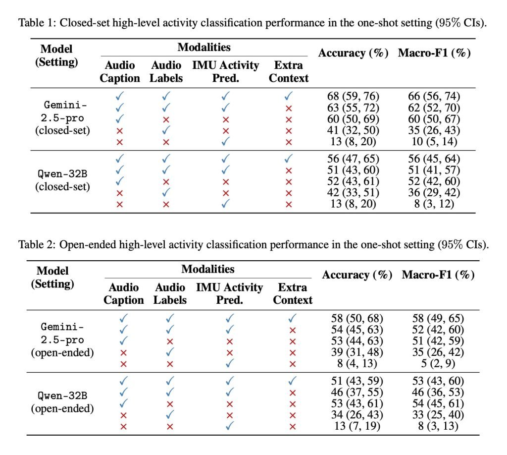 研究人员将音频和运动数据输入小型模型生成文本描述与分类预测,再将结果输入不同LLM(Gemini-2.5-pro与Qwen-32B)以评估活动识别能力。