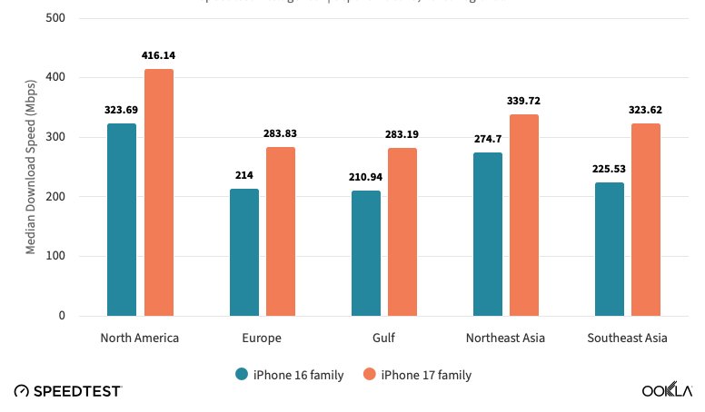总体而言,配备N1芯片的iPhone的平均下载和上传速度比一年前的iPhone 16型号高出约40%。例如,在北美,Ookla记录到iPhone 16的平均下载速度为323 Mbps。而iPhone 17的Wi-Fi得分要高得多,平均下载速度达到416 Mbps。