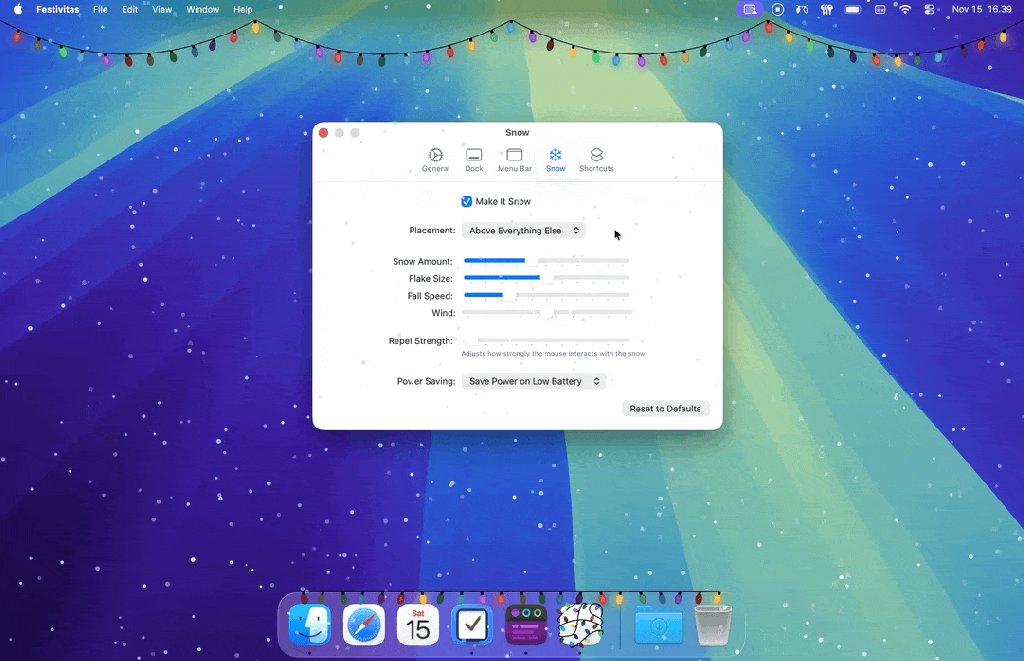 今年Festivitas除了动态圣诞灯饰外,还为Mac带来了赏心悦目的飘雪特效。应用允许调节雪量、雪花尺寸、飘落速度和风向参数,还能让飘落的雪花与鼠标指针产生互动效果。