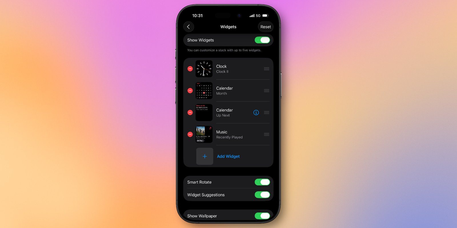系统支持组件堆叠功能,最多可叠加五个小组件,并可选是否启用”智能轮播”。