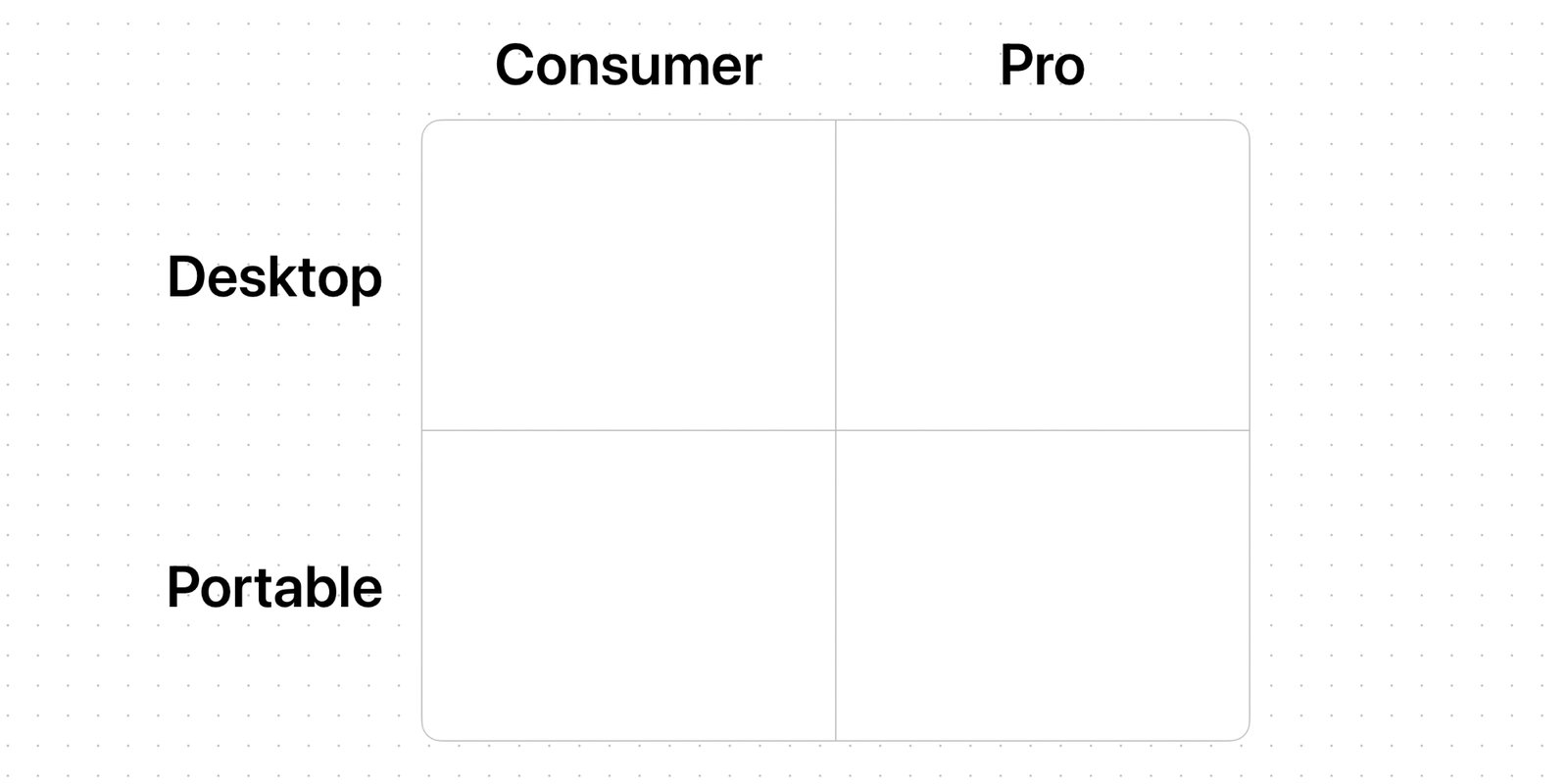 要理解苹果iPhone调整所面临的挑战,我认为回顾一下乔布斯著名的2×2产品矩阵会很有帮助。