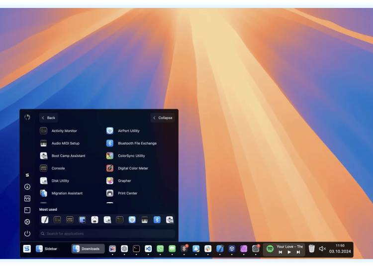 Sidebar 1.8.10 的应用启动器功能为习惯 Windows”开始菜单”或 Linux 应用启动器的用户提供了熟悉的体验。点击 Sidebar 标志会显示完整的应用程序列表,支持按名称搜索和常用应用推荐。这一界面还包括快速链接至系统设置、个人文件夹和电源选项(睡眠、重启、关机),使这些常用功能无需通过苹果菜单即可访问。