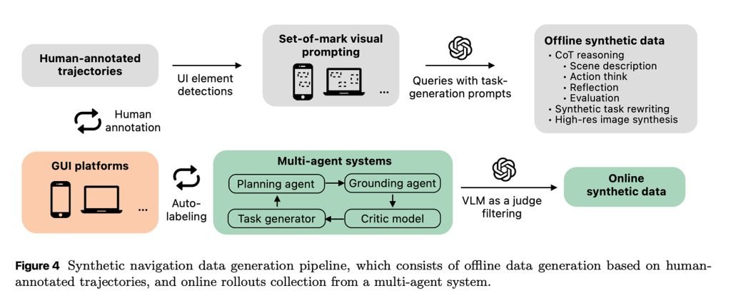 论文另一大亮点在于:Ferret-UI Lite几乎完全靠“自产自销”来生成训练数据。研究团队构建了一个多智能体系统,直接与真实GUI环境交互,大规模自动产生合成训练样本。