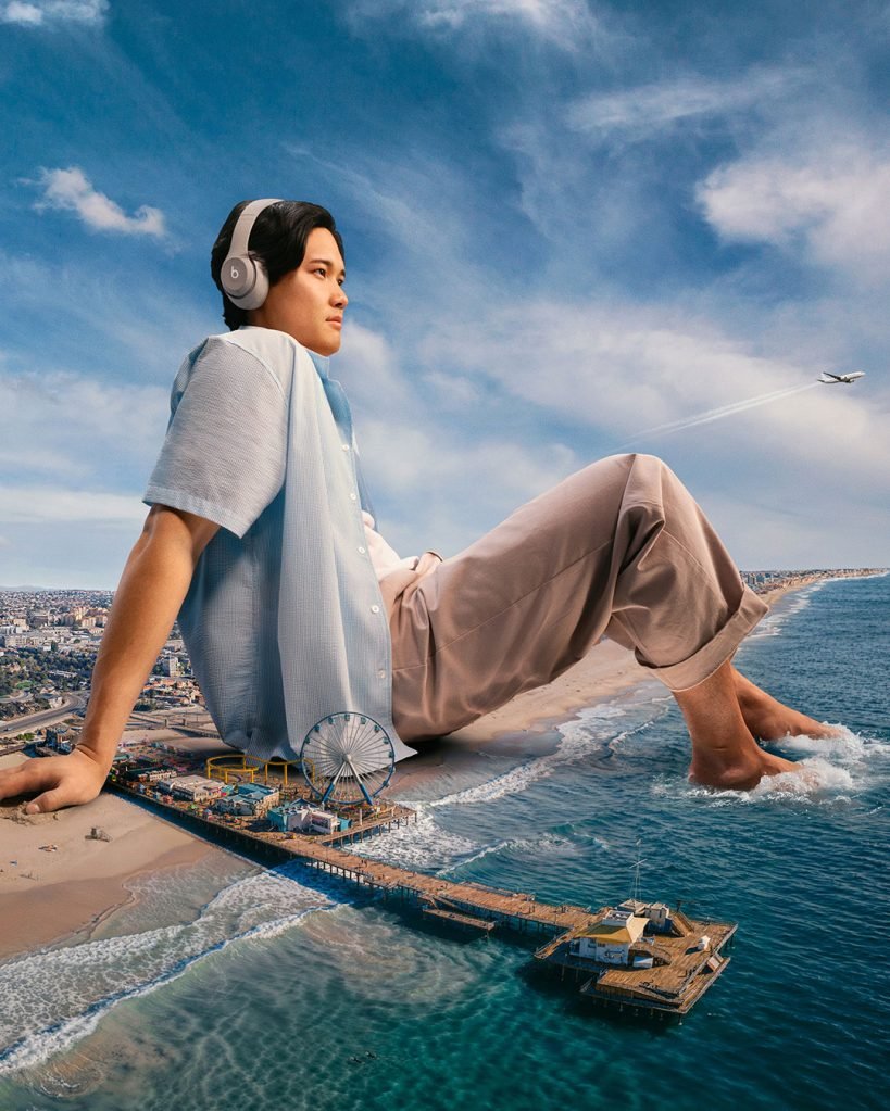 此次新广告为推广Powerbeats Pro 2、Beats Studio Pro及Powerbeats Fit等明星产品,Beats请来了四届MLB MVP大谷翔平,以超现实的巨大比例,将他置于多个洛杉矶标志性背景之前。
