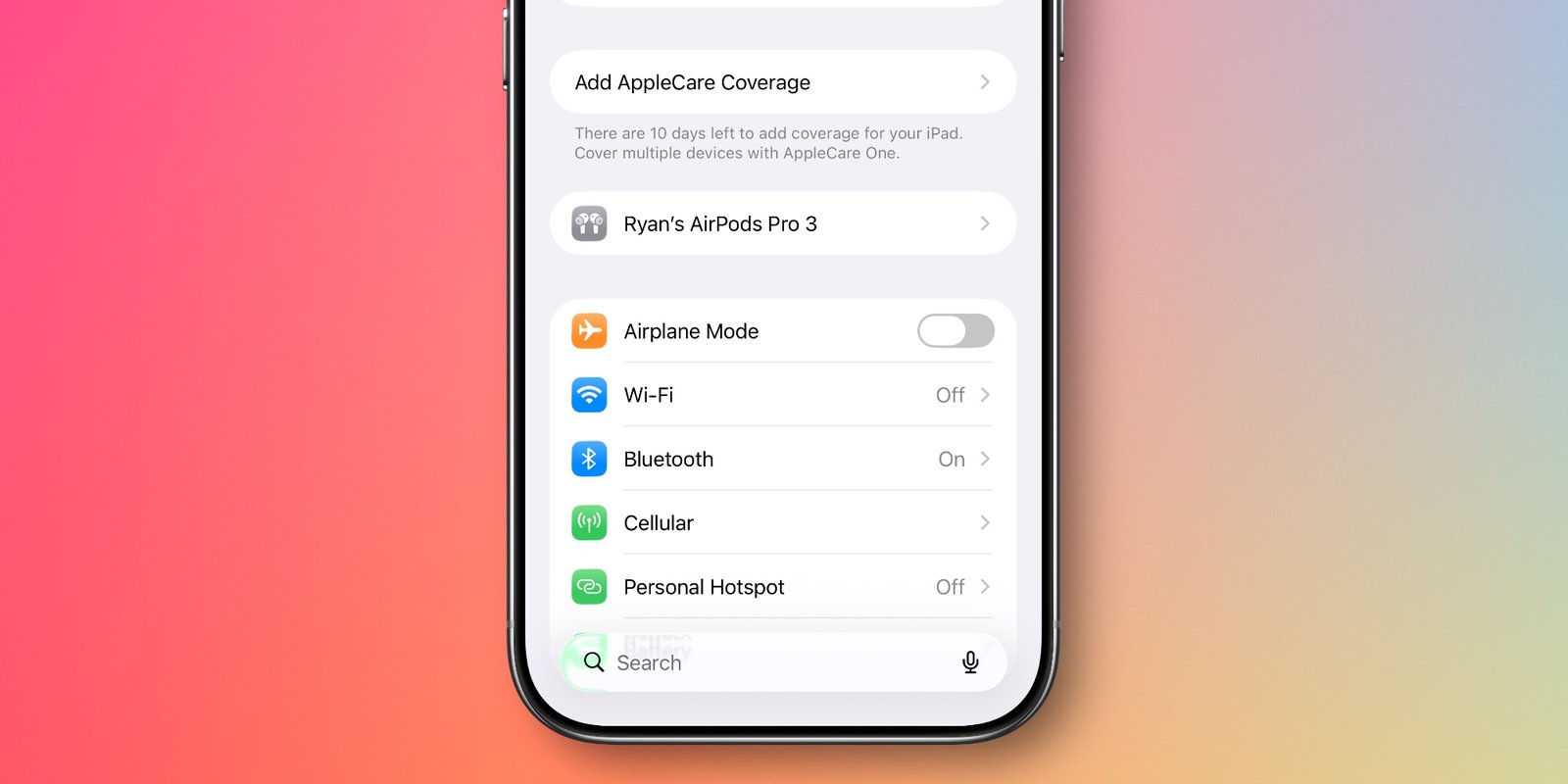 当你将 AirPods 放回充电盒并合上盖子时,AirPods 面板会在几秒钟内从设置应用的主页面消失。然而,我发现了一个偏差,这似乎仅在 AirPods 固件更新进行时才会发生。在两次不同的情况下,即使在我将 AirPods Pro 3 放回充电盒并合上盖子后,AirPods 面板仍然停留在我的设置应用中。面板停留了几分钟(而不是几秒钟),直到固件安装完成。这两次情况都发生在苹果刚刚发布新 AirPods 固件之后,并且我在事后立即验证了内部版本号的变化。