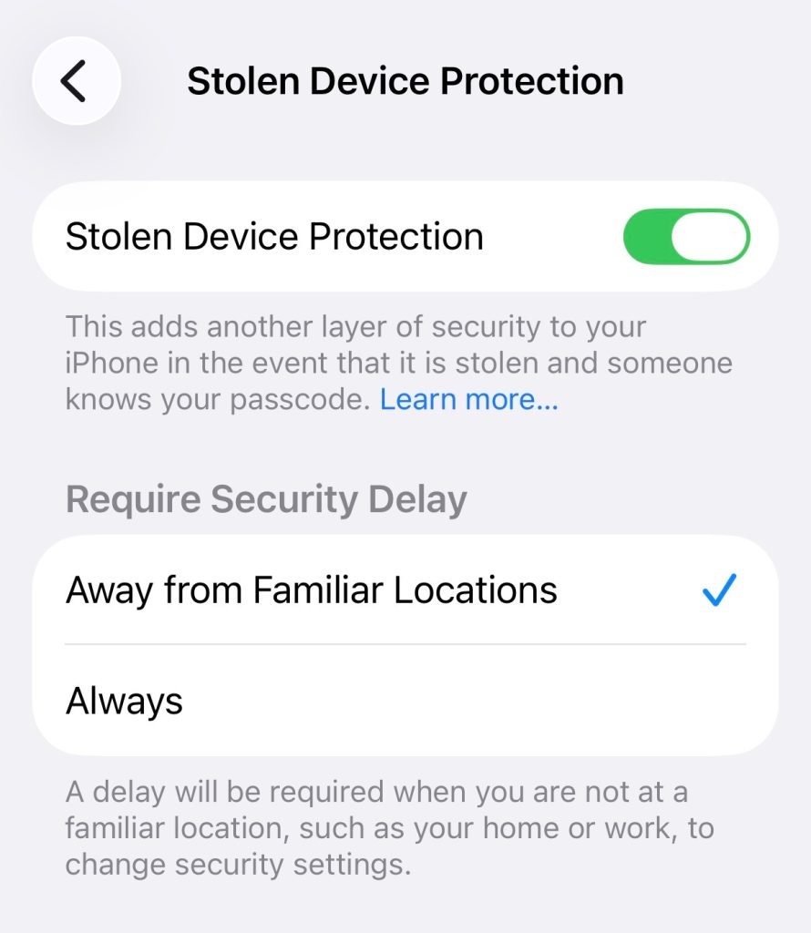 同时,它对关键安全设置的更改设置了一小时的安全延迟,目的是给受害者留出足够时间将iPhone标记为丢失(并擦除数据),防止窃贼完成更改。该延迟可设置为“始终”或“离开熟悉位置时”。