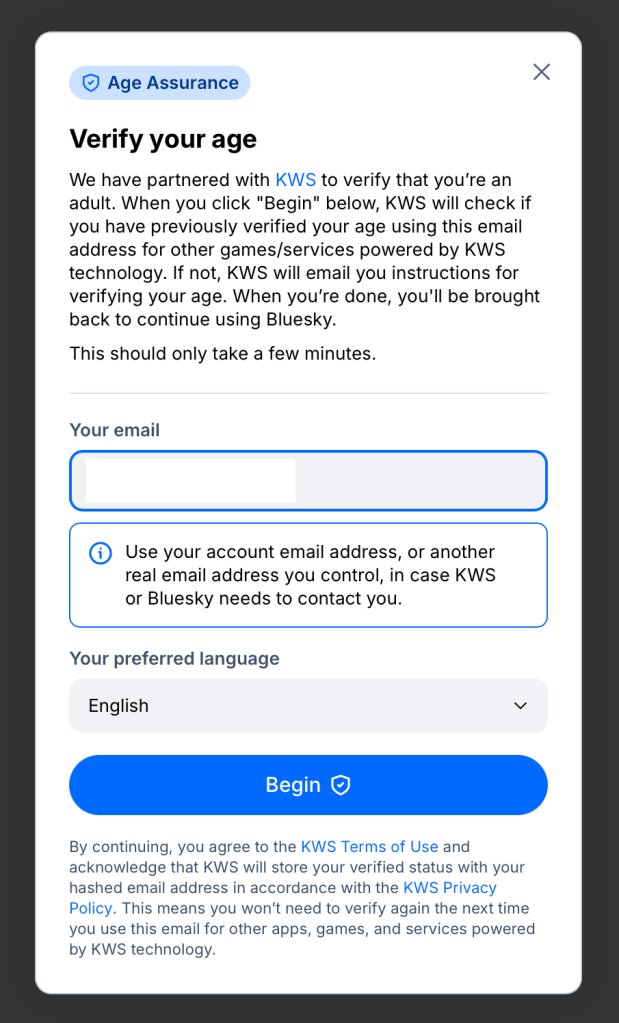 点击“开始”按钮,会提示 Bluesky 向你发送一封电子邮件,内含通过 KWS 开始年龄验证的链接。此过程中的链接会将你带到此处和此处。