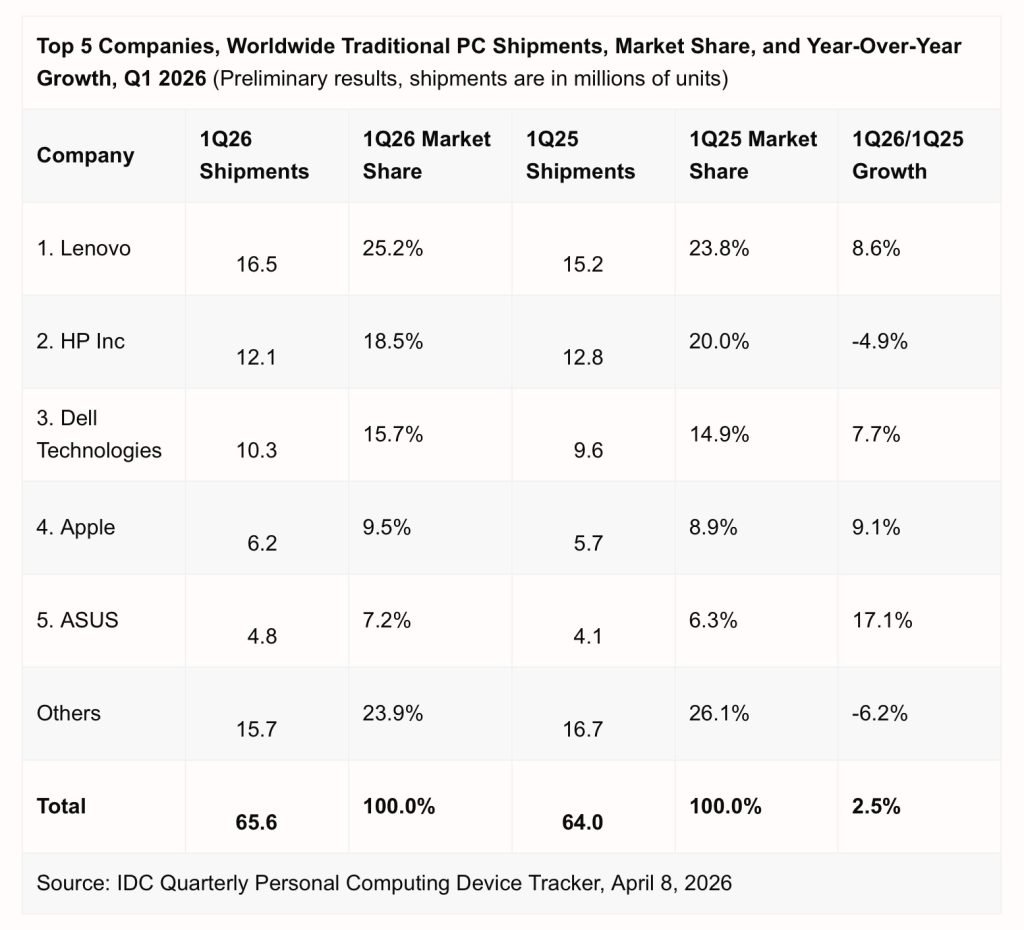 尽管如此,在IDC全球传统PC出货量排名中,苹果和华硕仍位列第四和第五,排在联想、惠普和戴尔之后。