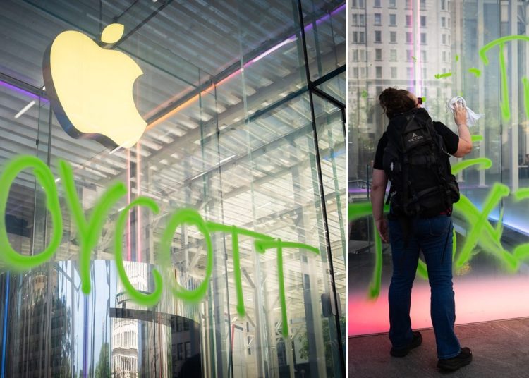 纽约第五大道苹果旗舰店遭气候变化抗议者喷涂,呼吁抵制这家公司。