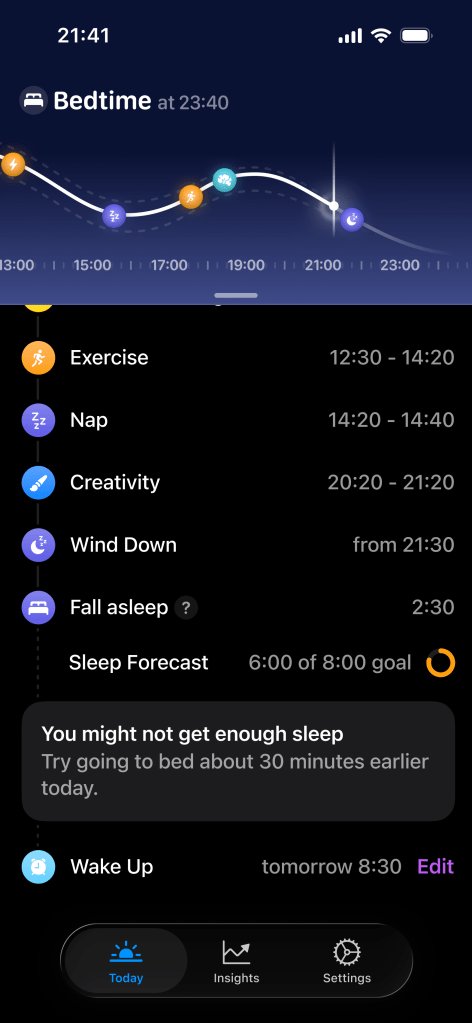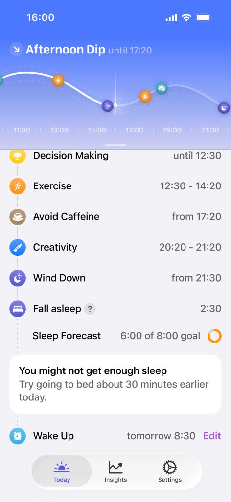 通过分析你的睡眠数据,Peaks 能精确告诉你每天的能量巅峰时段出现在什么时候。这让你可以更聪明地安排高强度工作、最佳训练时间、避免喝咖啡的窗口,以及何时开始放松进入休息模式。核心目标就是:彻底告别那些不合时宜的能量崩盘。