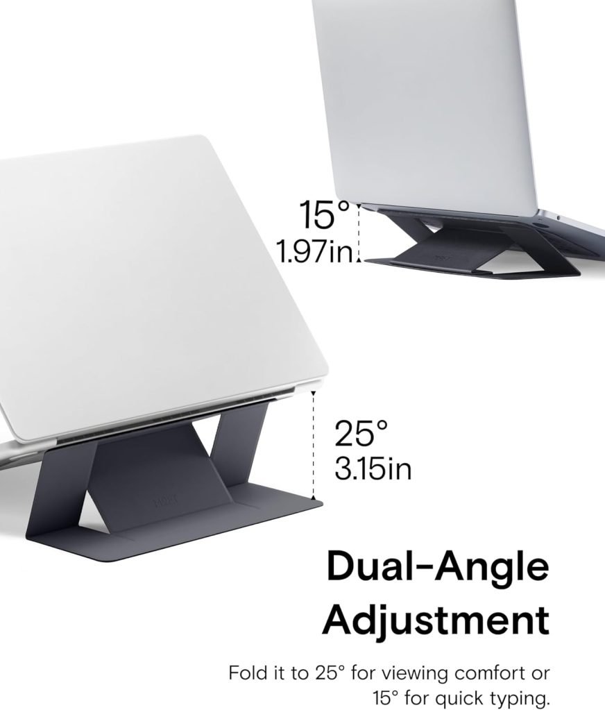 这款支架我几乎每台笔记本都在用,简单好用,能明显提升使用体验。MOFT笔记本支架设计很简洁,分粘贴版和摩擦版两种。我个人更喜欢粘贴版的,用起来不会忘。安装超级简单,把支架贴在MacBook底部,就能获得15度和25度两个新视角, ergonomics好多了。支架厚度只有0.12英寸,重量不到3盎司,折起来几乎感觉不到它的存在。这样既能改善观看角度,又不用固定死一个方案。价格从24美元起,16英寸MacBook Pro的非粘贴版最高39美元。