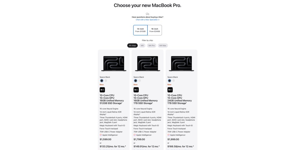 以 MacBook Pro 为例。以前点击“购买”按钮后,苹果在线商店会先带你进入一个落地页。在这个页面上,你会看到多种预组装好的配置选项,涵盖不同芯片、内存和存储组合。