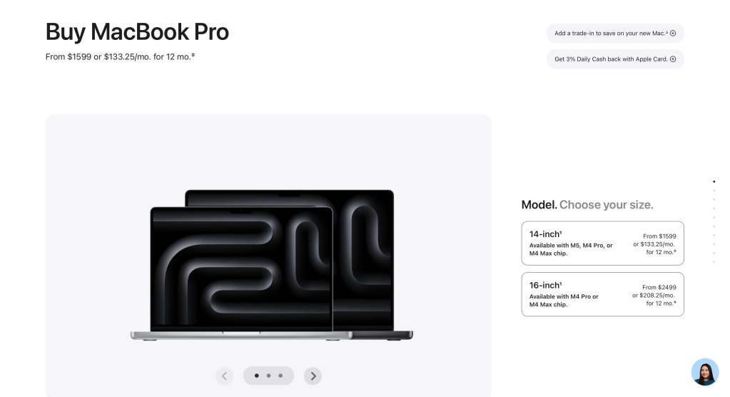 以 MacBook Pro 为例。以前点击“购买”按钮后,苹果在线商店会先带你进入一个落地页。在这个页面上,你会看到多种预组装好的配置选项,涵盖不同芯片、内存和存储组合。