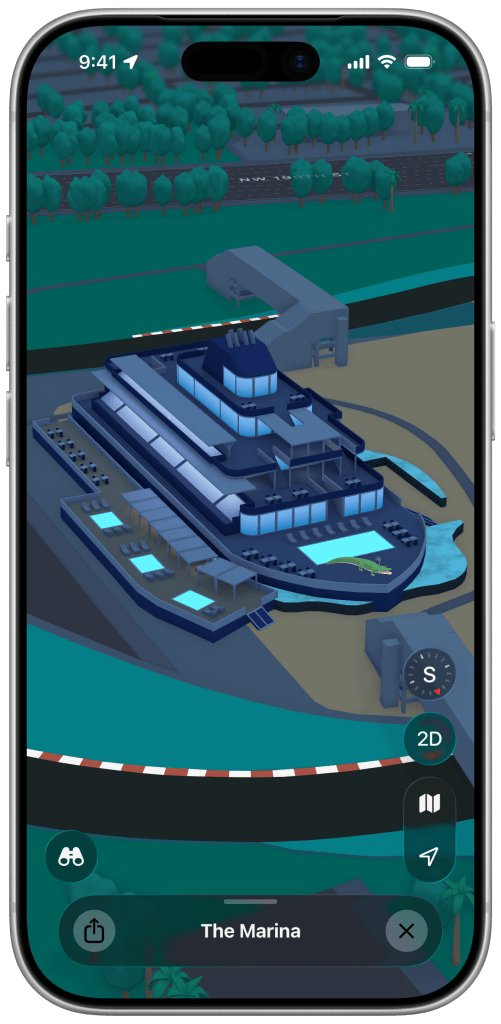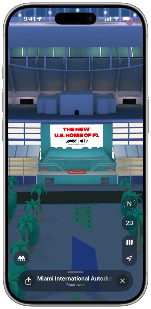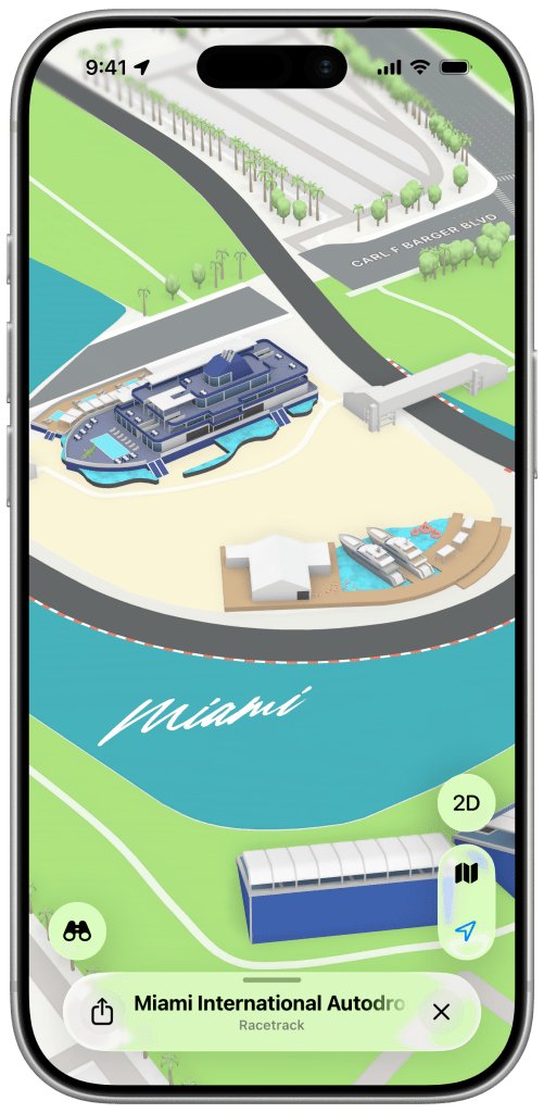 全新的迈阿密F1大奖赛体验今天已经在苹果地图上线。它以惊艳的3D效果展示了迈阿密国际赛车场的关键地点,包括看台、码头区、终点线等多个地标的3D模型,甚至还有维修站大楼的完整3D渲染,里面还能看到赛车的样子。