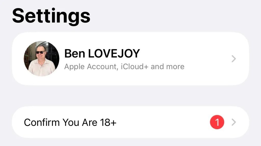 升级到iOS 26.4后,英国用户的设置App里会出现一个新入口,标着“确认你已年满18岁”。