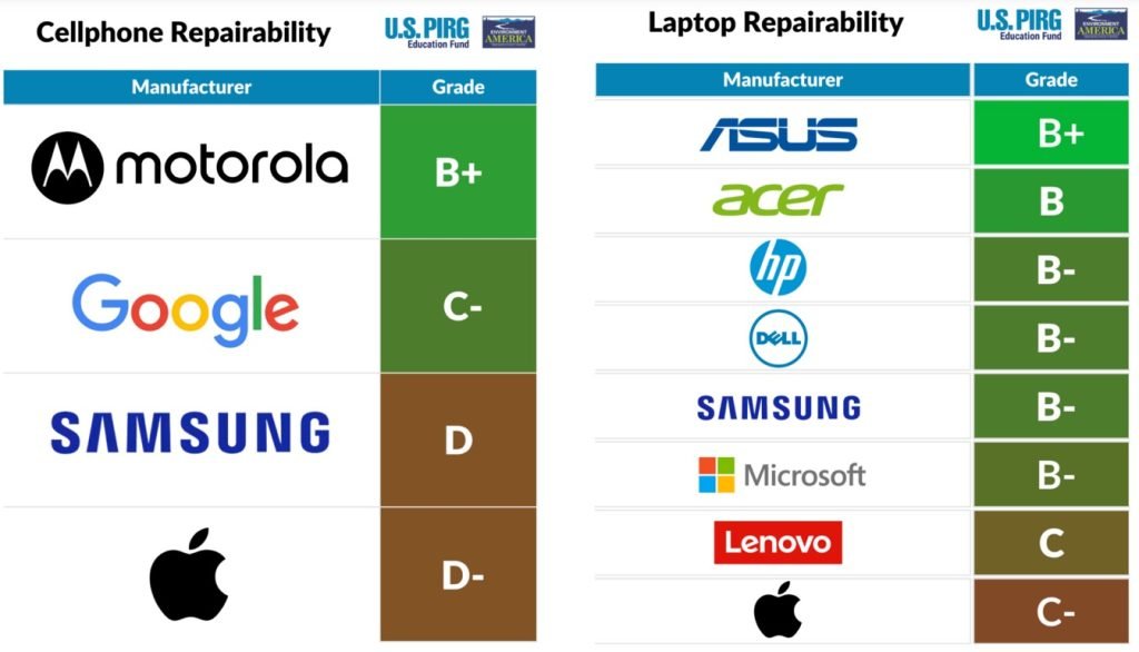笔记本电脑方面,华硕以B+获得最佳维修性评分,苹果则以C-排在最末。