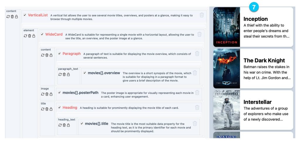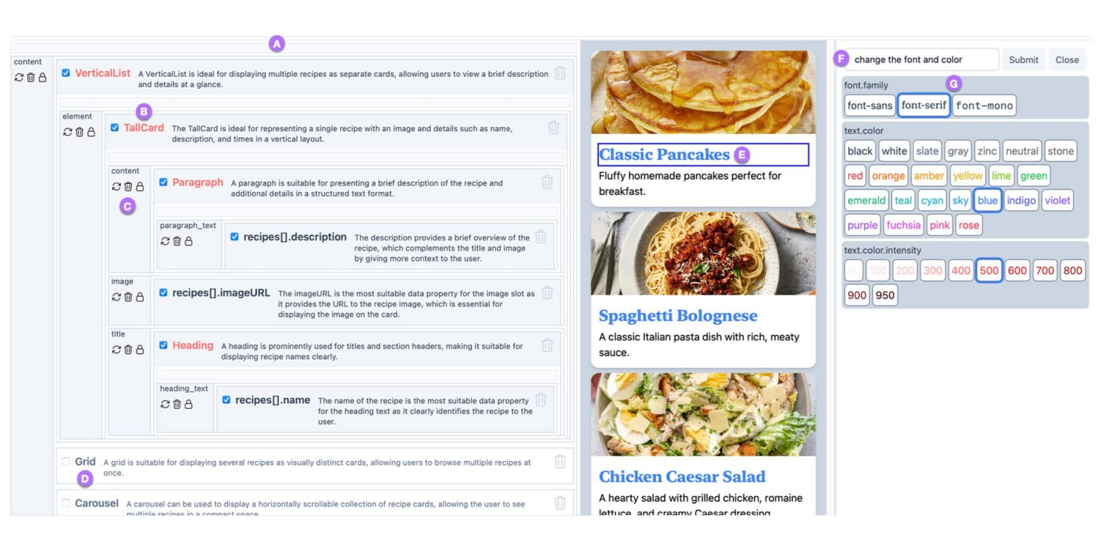 在 SQUIRE 中,用户先输入一个提示,说明对 UI 的设计目标,同时提供一些样本数据作为参考。然后,用户通过自上而下的方式构建组件树,提示 SQUIRE 去填充那些代表缺失功能的「空洞」。针对这类请求,SQUIRE 会生成一系列合适的备选方案,每个方案都只针对指定位置。用户点击某个方案后,实时预览和底层代码都会马上更新,很容易看出差别。用户还能针对 UI 特定区域的外观提出修改要求,而且系统保证只改动指定范围内的代码,不会影响到其他地方。对于这种请求,SQUIRE 会生成一些临时控制选项,让用户快速应用相关改动,不用再重新写提示。在整个过程中,大语言模型就像一位助手,提供合理的选择供用户参考,最终决定权还是在用户手里。