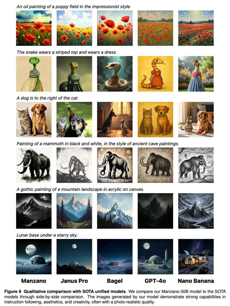 研究人员还指出,在多项权威基准测试中,“Manzano 3B和30B模型的表现优于或至少能与当前最顶级的统一多模态大语言模型相媲美。”