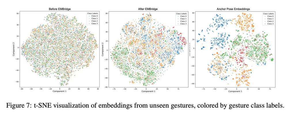 随后通过表示对齐,让EMG编码器能够从姿态编码器中学习,从而使EMBridge学会从EMG信号中识别手势模式。