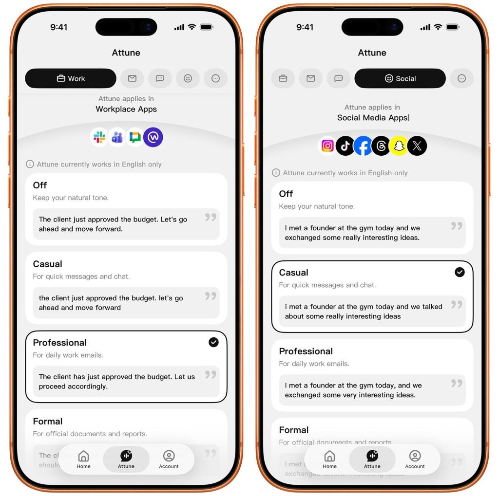 我用下来觉得最强的是Attune功能,能选Casual、Professional或Formal三种预设,根据不同App自动调整文字风格。