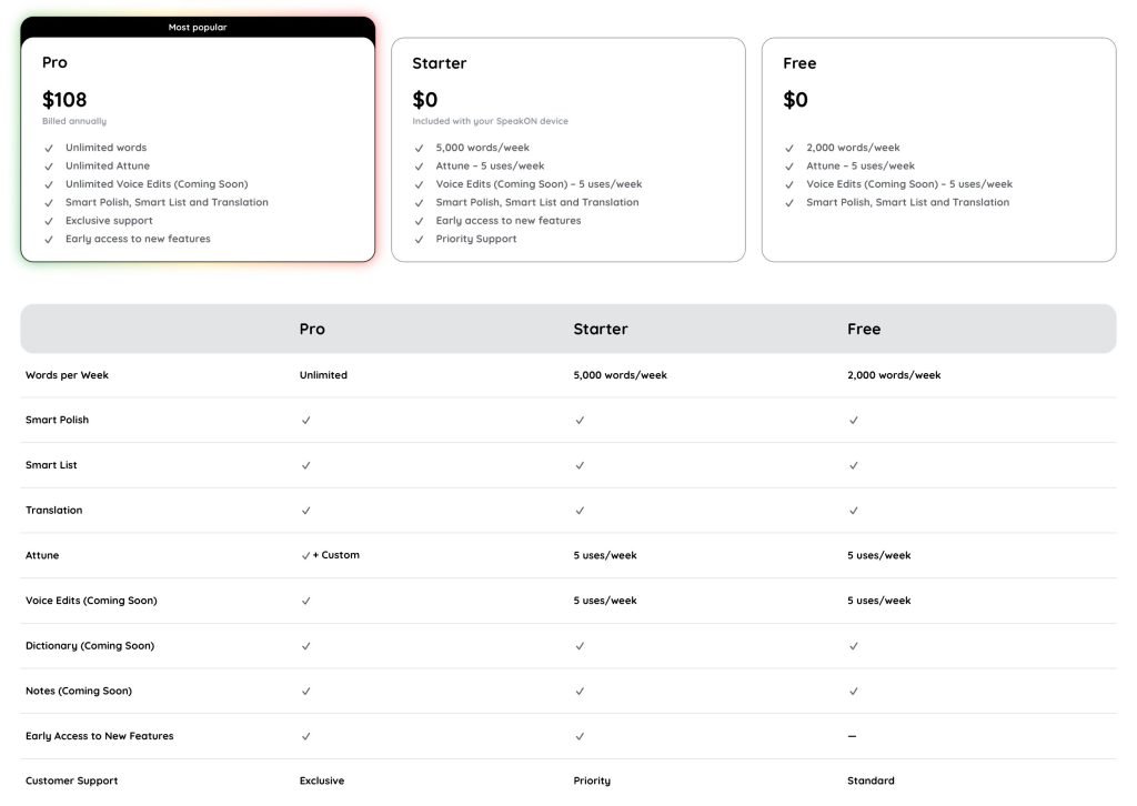 设备本体卖129美元,但更高的字数上限和更频繁使用Attune等功能,都要订Pro计划——年付108美元或月付12美元。