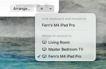 把 iPad 当外接显示器很实用,但如果你还想把 iPad 当 iPad 用,只是希望用同一套键盘鼠标/触控板控制 Mac 和 iPad,不用一直切换蓝牙连接呢?那就是通用控制的用武之地了。通用控制让你用一套键盘、鼠标或触控板无缝控制 Mac 和 iPad,感觉就像在同一台电脑的两个屏幕间移动,哪怕它们是两台独立的设备。你甚至还能直接在两者之间拖拽文件。开启方式和 Sidecar 几乎一样,只有一点不同: