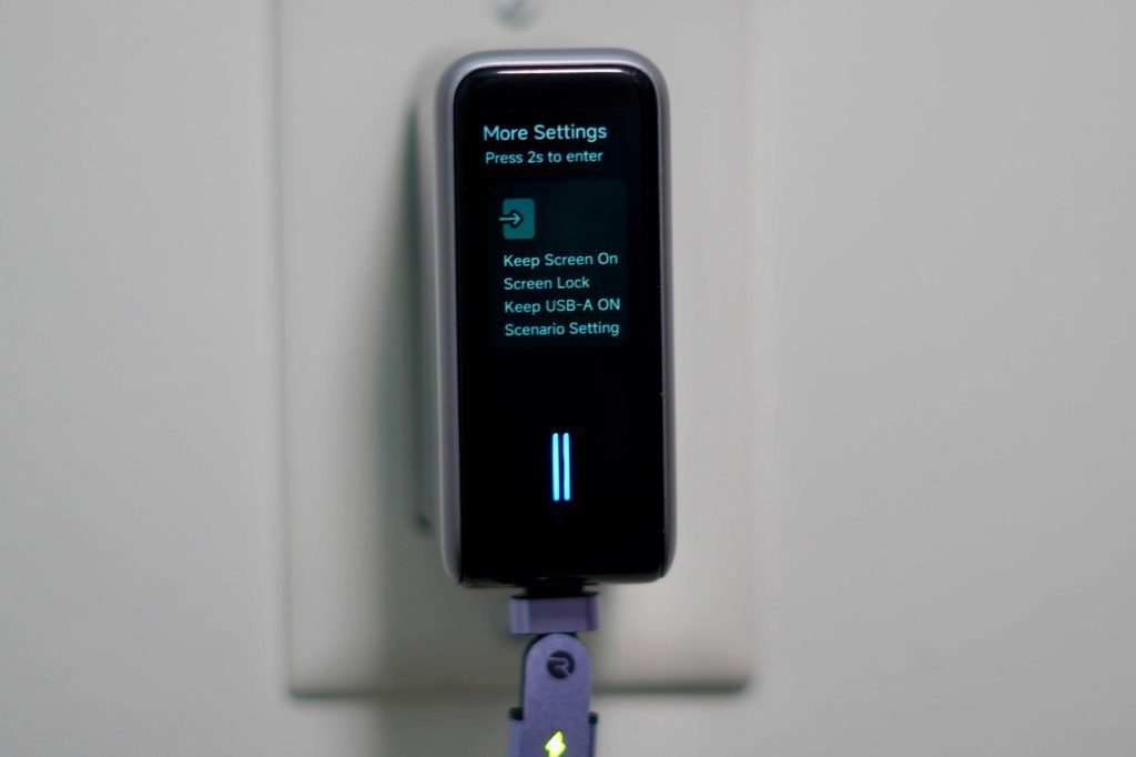最后一个让我印象深刻的点是温度监测。显示屏旁边有个触控区域,可以切换不同界面,其中一个界面就能实时显示温度。最贴心的是,当温度过高时,它会主动降低充电功率,确保温度不会超过安全范围,尤其是在满负载使用的时候特别安心。整个界面设计也挺舒服的。