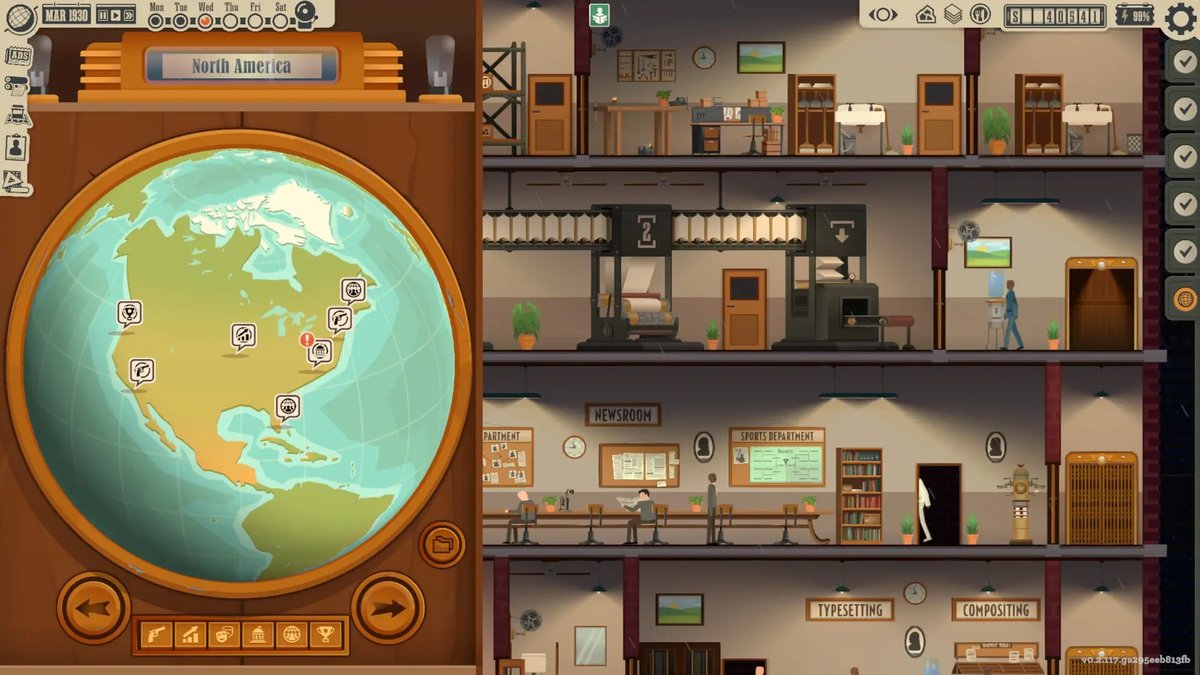 视觉与音效上,游戏采用复古像素风格,配以时代感强的背景音乐,营造出1930年代纽约的生动氛围。Mac版的优化确保了稳定帧率,即使在多楼层塔楼下也鲜有卡顿。相比其他模拟游戏,News Tower的独特之处在于其新闻编辑环节——组合故事、调整版面,仿佛亲身参与历史事件的塑造。