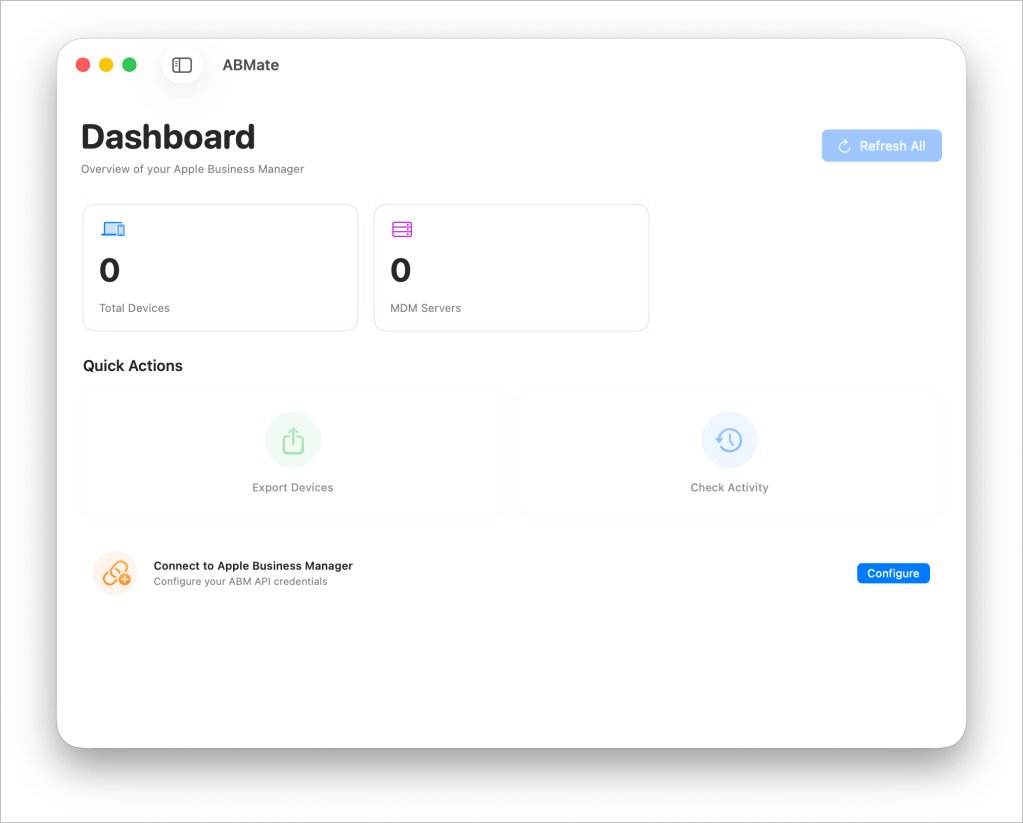 ABMate 是一款开源工具,它将 Apple Business Manager API 封装成了原生的 macOS 界面。应用采用 SwiftUI 开发,在 Mac 上用起来自然又流畅。核心思路非常简单:不想再登录 Apple Business Manager 网页去查设备状态?直接打开 ABMate 就行。它直接调用全新的 Apple Business Manager API,拉取数据的速度远超官方网页版的渲染加载。
