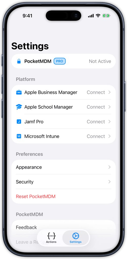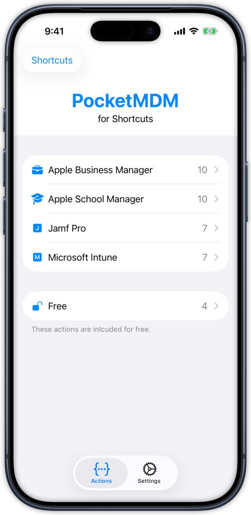 PocketMDM 是专门给苹果 IT 管理员设计的。它把 iPhone 和设备管理平台之间的距离拉近了,直接把常用自动化功能带进了苹果快捷指令。目前支持 Apple Business Manager、Apple School Manager、Jamf Pro 和 Microsoft Intune。我个人还挺希望以后能加入更多设备管理服务。