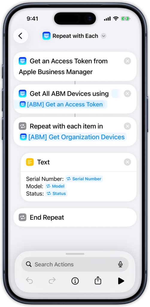 PocketMDM 的真正厉害之处,是让你能轻松做出自定义的苹果快捷指令。比如你刚拆开一批新 MacBook,你不用跑回工位去 Apple Business Manager 里操作,完全可以做一个快捷指令:扫一下条码,它就通过 PocketMDM 自动连上 Apple Business Manager 接口,把设备分配到你指定的管理服务器上。类似地,你也可以给 Jamf Pro 或 Microsoft Intune 做流程,快速检查设备合规情况,或者调出库存记录查各种信息。