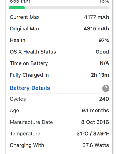 打开Battery Health 3 3.01,你会看到一个简洁的界面,分成几个主要部分。首先是充电和健康指标,这里直接显示电池当前的最大容量与原始容量的比率,让你清楚看到电池老化程度。举例来说,如果你的MacBook用了一两年,这个百分比能帮你判断是不是该考虑换电池了。接下来是电池细节页,列出了温度、电压、电流、功率消耗、循环次数和制造日期这些专业数据。每个指标旁边还有个小问号,点开就能看到解释,不用自己上网查。