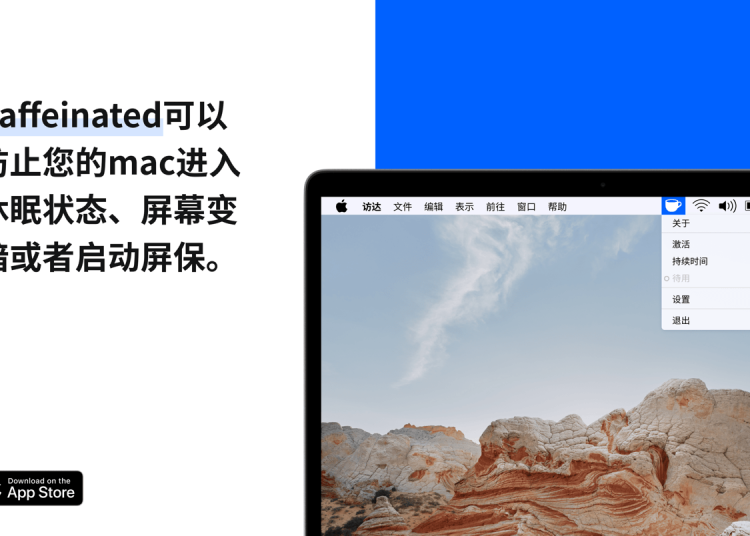 Caffeinated 通过在菜单栏提供一个简洁的控制入口,允许用户便捷地管理Mac的睡眠设置。用户只需点击菜单栏图标,即可选择让Mac在一段时间内或无限期地保持唤醒状态。这个工具尤其适用于需要Mac持续运行的任务场景,例如下载大文件、进行长时间渲染或演示屏幕内容。