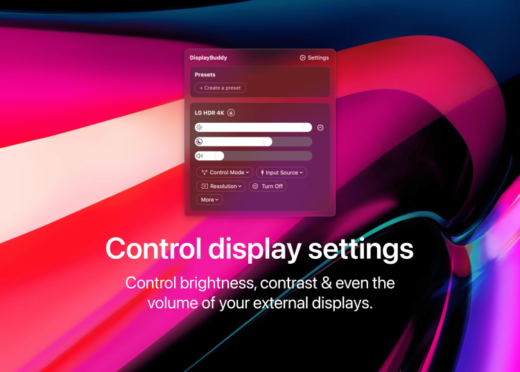 DisplayBuddy 是一款专为 macOS 设计的显示器管理应用,允许用户通过直观的菜单栏控件或键盘快捷键,直接管理多台外接显示器的各项设置。应用支持包括亮度、对比度、音量输入切换在内的多种硬件级调节,尤其适合拥有多台不同品牌显示器的专业用户和创作者。