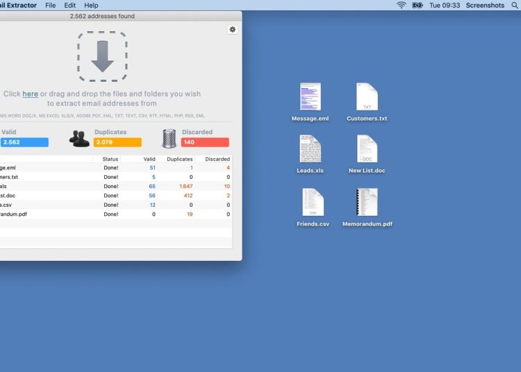 这款软件本质上就是专门干提取邮箱地址的活儿,从各种文本来源里挖出有效的邮件地址。支持的文件类型挺全的,TXT纯文本不用说,PDF文档、DOC和DOCX的Word文件、XLS和XLSX的Excel表格、HTML网页文件、甚至Apple Mail和Outlook的EML、EMLX邮件文件,还有MBOX邮箱归档、SQL数据库文件、RTF格式,全都吃得下。拖拽操作是它的招牌,你可以直接把文件或者整个文件夹扔到程序窗口里,或者干脆拖到Dock图标上,它就开始多线程干活了。