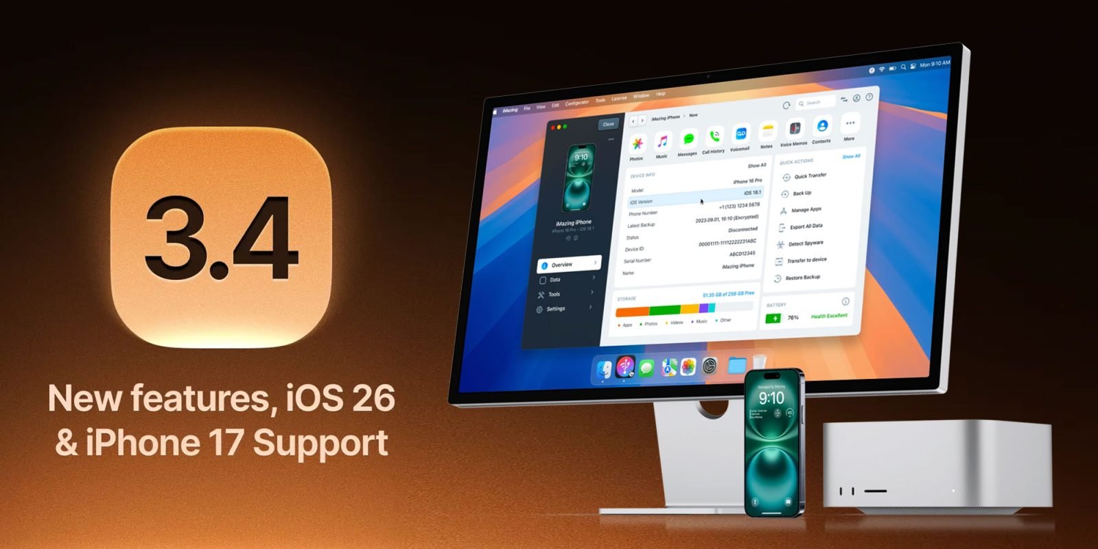随着iPhone 17系列上月上市,iMazing 3.4同步推出,全面支持iOS 26、macOS Tahoe 26及新设备。