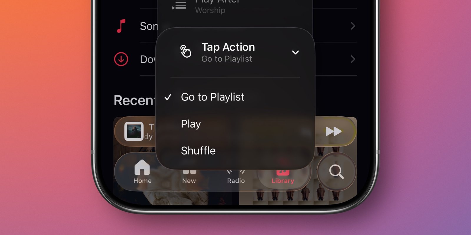 一层一层点进 Music 的各种界面去找专辑或歌单,实在有点费时间。而置顶的内容就醒目地排在资料库首页最上面。如果你已经在 iPhone 上把置顶项目的「点击操作」设成「播放」,这个设置也会同步到 CarPlay 里。