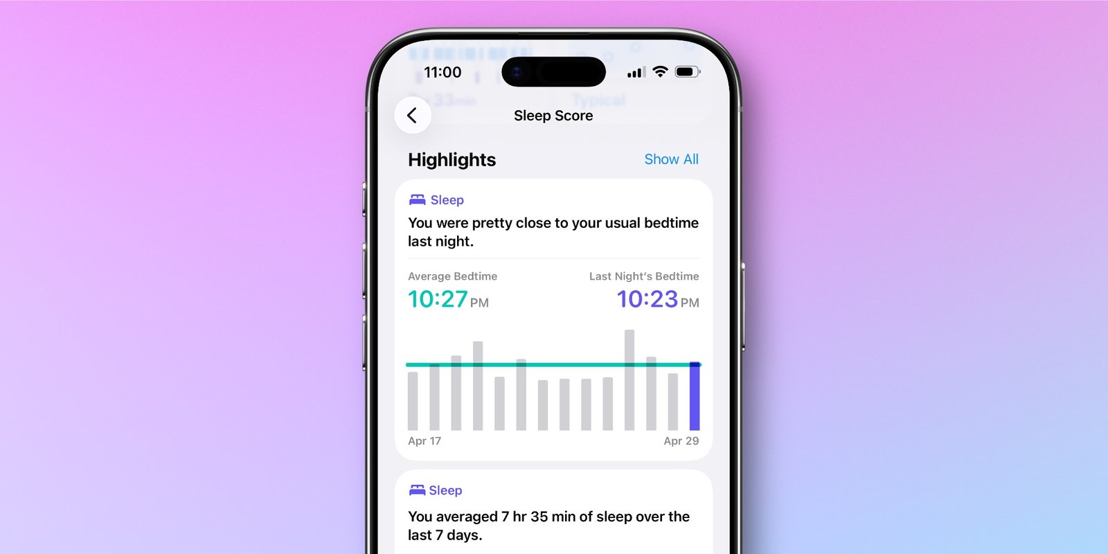 首先,在睡眠和睡眠分数页面的「亮点」区域,你会看到一个新的「就寝时间」亮点。