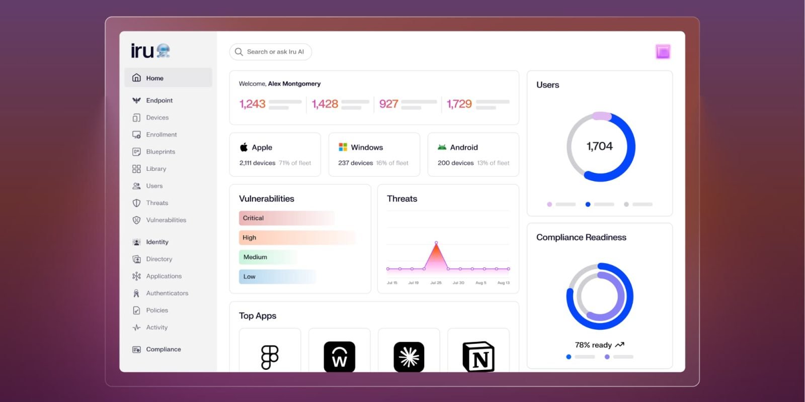 Iru 将自身定位为一个能够整合 IT 和安全团队一直难以统一的领域的平台:身份、访问、端点管理和合规性,所有这些都由 AI 驱动。Iru 旨在秉承这一设计理念并将其应用于整个 IT 技术栈。其全新的上下文模型可生成跨用户、设备、应用和策略的实时地图,将这些上下文转化为可操作的洞察和可供审计的证据。