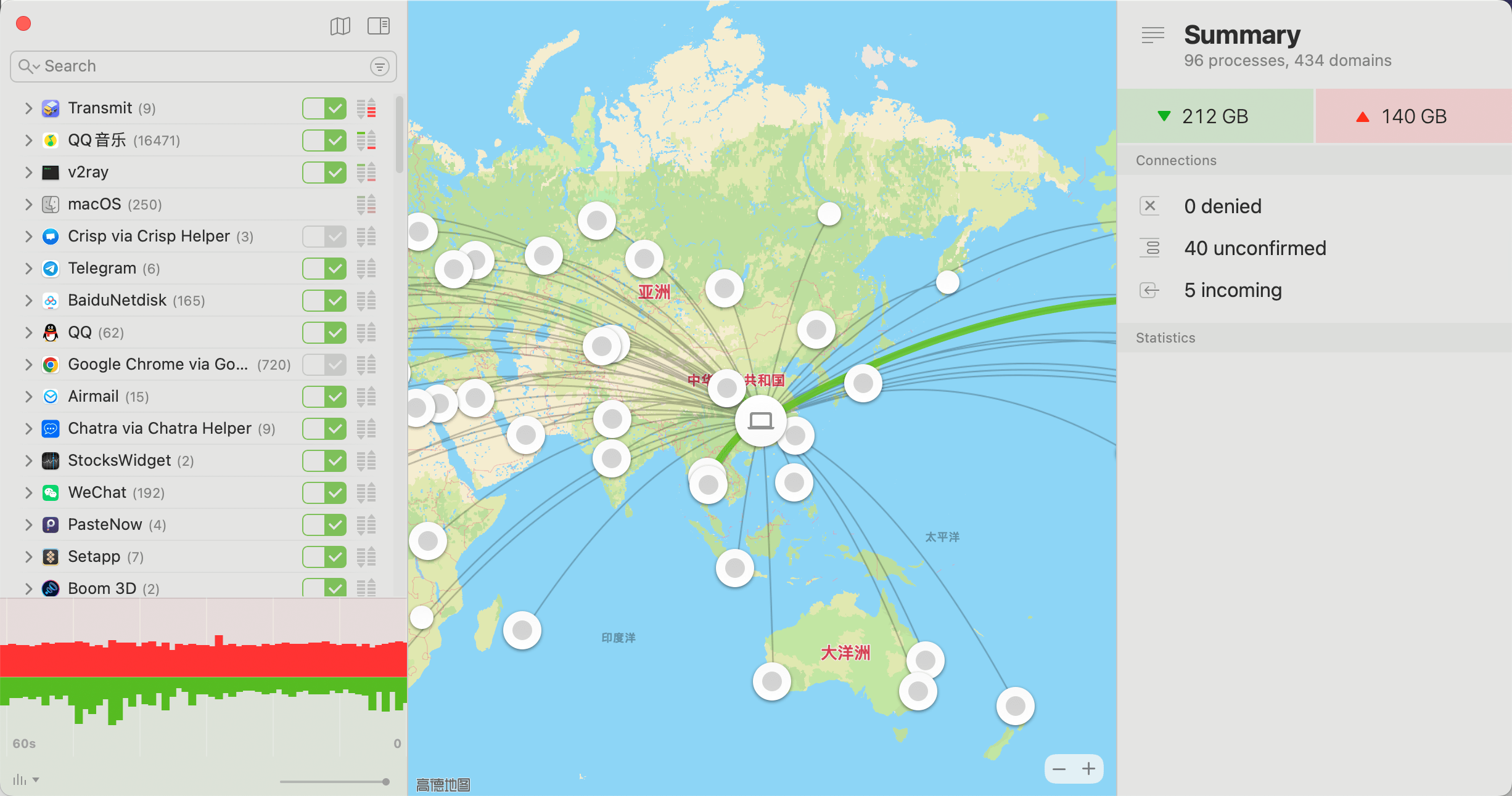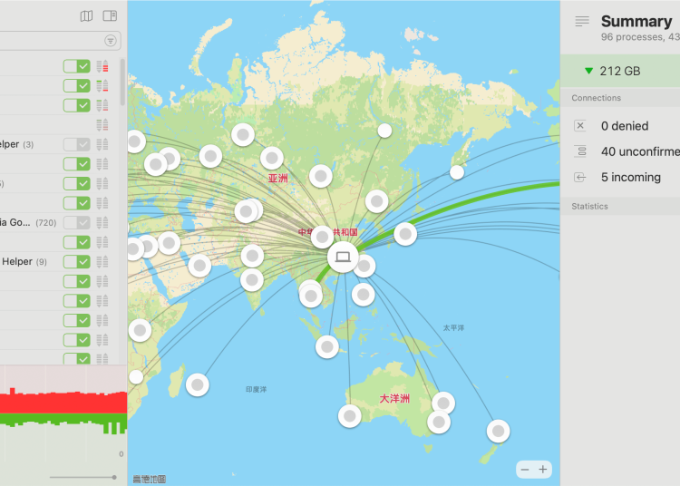 网络监控面板是 Little Snitch 的另一大核心功能,它以世界地图的形式实时可视化所有网络连接,让用户直观地看到数据流向何方。规则模式功能使用户能够为不同的网络环境(如家庭、办公室或咖啡馆)创建不同的规则集,实现自动化安全管理。