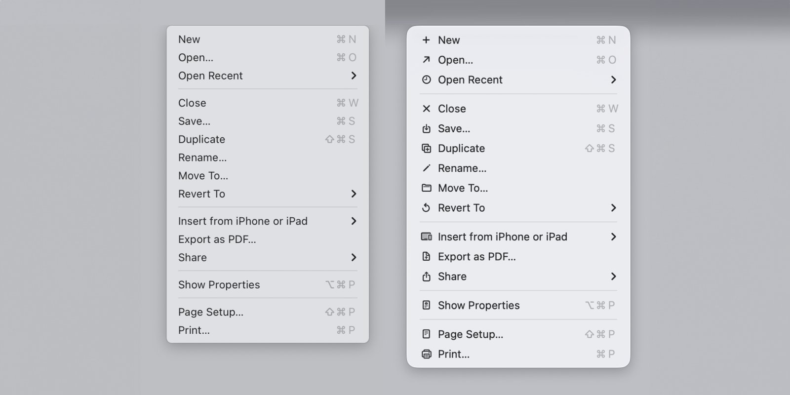 Prokopov 分享了该指南中的一幅图,展示了苹果称之为“丑陋”的菜单样式——每个菜单项都有各自的图标,并与该公司认为的良好实践(即在菜单中使用极少图标)进行了对比。