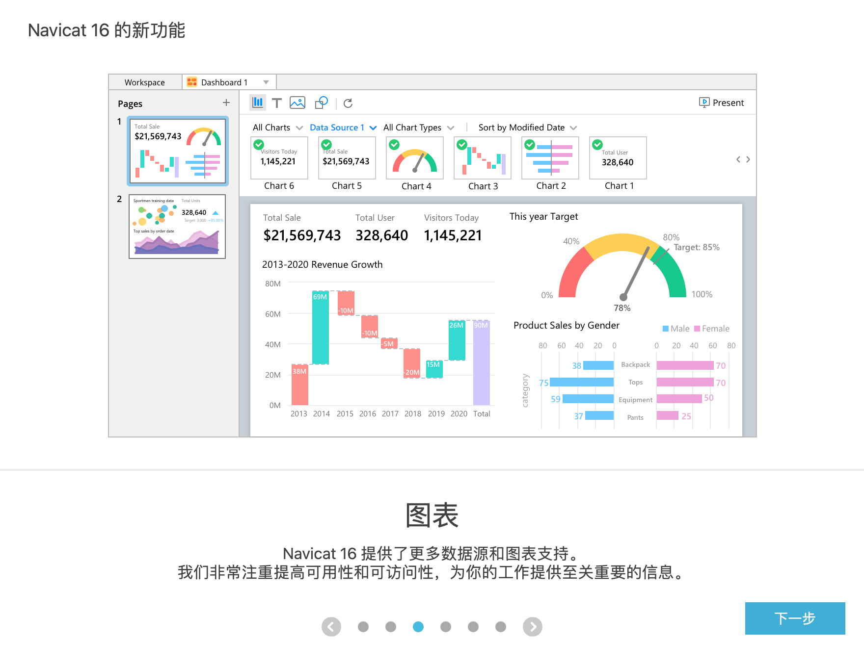 我们的智能图表工具中包含更多图表类型和新功能。连接到你选择的任何数据源,例如 Excel、Access 或 ODBC。你还可以使用自定义字段扩展数据:更改字段类型、串联字段、映射值或基于其他字段顺序排序。