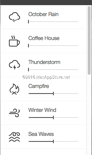 Noizio 2.2.0 延续了极简主义设计语言,主界面为单页式布局,所有音效以图标化分类呈现,用户可通过拖拽滑块实时调整音量比例。更新后的版本优化了以下细节:
