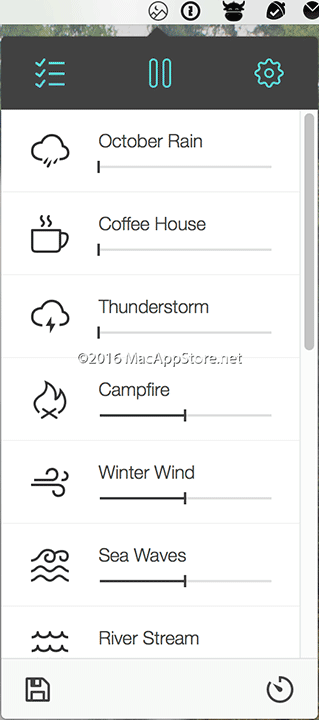 Noizio 2.2.0 延续了极简主义设计语言,主界面为单页式布局,所有音效以图标化分类呈现,用户可通过拖拽滑块实时调整音量比例。更新后的版本优化了以下细节: