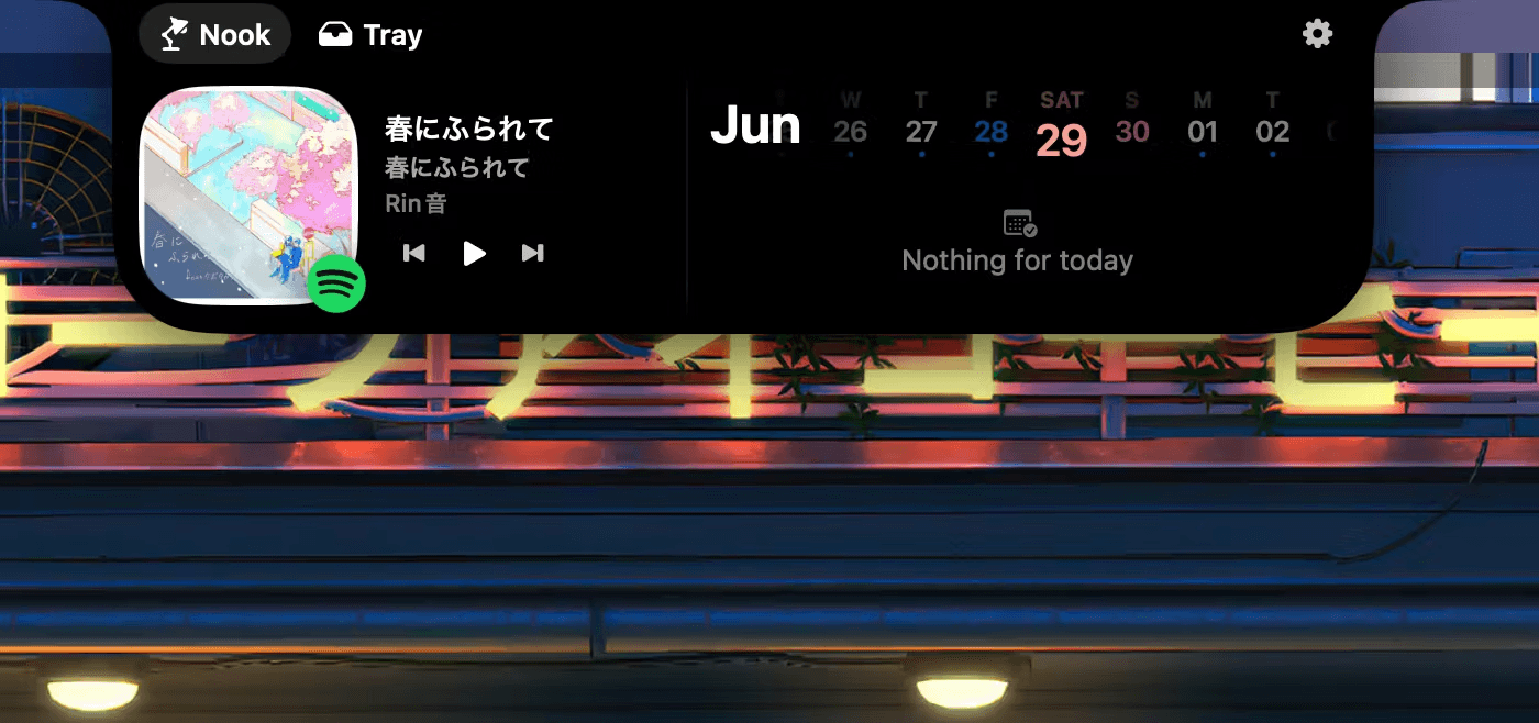 NotchNook的设计理念是将刘海区域从单纯的屏幕设计转变为提升用户体验的实用工具。用户可以通过悬停鼠标来触发NotchNook的界面,显示小组件、实时操作、文件夹和快捷播放栏等。此外,NotchNook还提供了一个托盘标签,用户可以将文件或应用程序放入其中,类似于macOS的dock,但当退出NotchNook时,托盘会自动清空。