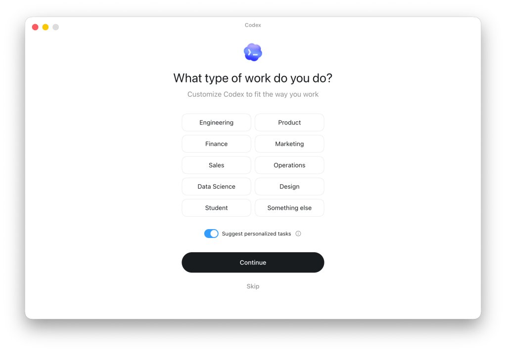 OpenAI 最近一直在大力更新 Codex 桌面版,几乎每天都有新内容。今天发布的更新里多了一个新提示,会直接问用户:“你是做什么工作的?”