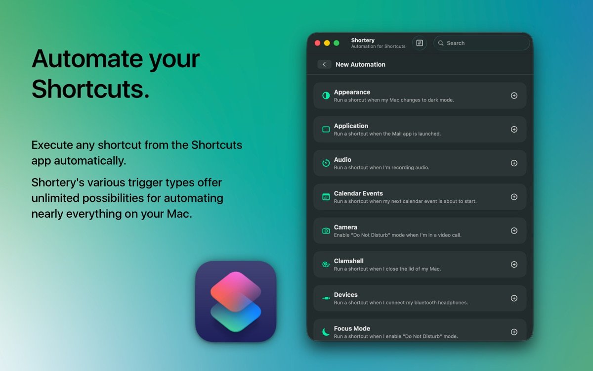 在Mac生态中,寻找一款能真正简化日常操作的工具总是令人兴奋。Shortery 8.5 作为一款专注于自动化Apple Shortcuts的软件,正悄然改变用户对Mac的交互方式。它不是简单的快捷键管理器,而是通过智能触发机制,让你的Mac在各种场景下自动执行任务,仿佛拥有了自己的思维。 无论你是开发者、设计师还是普通办公族,这款工具都能帮助你摆脱重复劳动,专注于更有创造性的工作。
